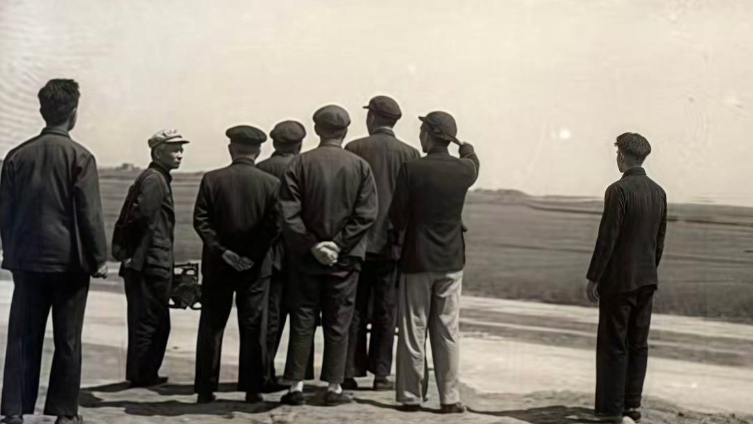 1955年,校長(zhǎng)彭康與教授們?cè)谖靼阐溙镏刑た毙滦V罚▓D片來源:西安交通大學(xué)新聞網(wǎng))
