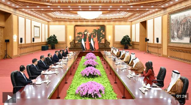 習(xí)近平指出,阿聯(lián)酋是中國的全面戰(zhàn)略伙伴,中方始終高度重視發(fā)展中阿關(guān)系。當(dāng)前,世界之變、時(shí)代之變、歷史之變正以前所未有的方式展開,人類社會面臨和平還是戰(zhàn)爭、團(tuán)結(jié)還是對抗、發(fā)展還是衰退的歷史抉擇。中國和阿聯(lián)酋作為全球南方重要成員,有必要加強(qiáng)協(xié)調(diào)、增進(jìn)合作,打造更加穩(wěn)固堅(jiān)韌、富有活力的中阿全面戰(zhàn)略伙伴關(guān)系。