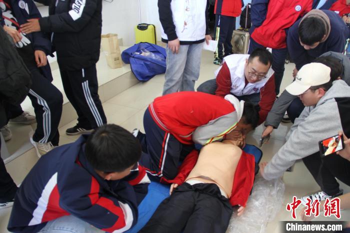 圖為內(nèi)蒙古醫(yī)科大學(xué)附屬醫(yī)院青年志愿者服務(wù)隊(duì)進(jìn)校園,王坤(左三)教學(xué)生心肺復(fù)蘇急救方法?!?nèi)蒙古醫(yī)科大學(xué)附屬醫(yī)院供圖