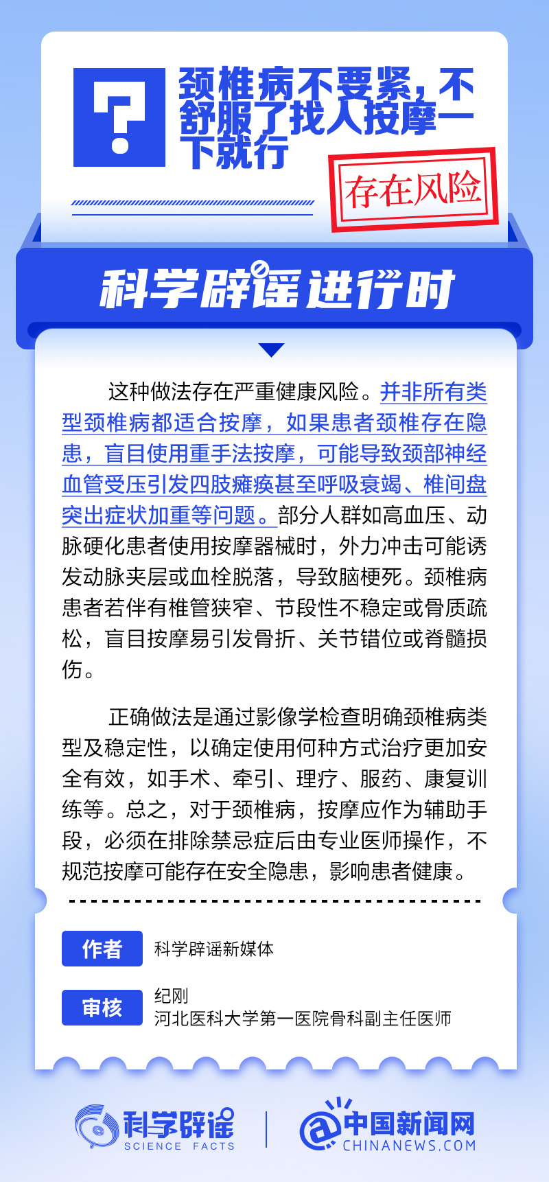 并非所有類(lèi)型頸椎病都適合按摩,如果患者頸椎存在隱患,盲目使用重手法按摩,可能導(dǎo)致頸部神經(jīng)血管受壓引發(fā)四肢癱瘓甚至呼吸衰竭,椎間盤(pán)突出癥狀加重等問(wèn)題。部分人群如高血壓、動(dòng)脈硬化患者使用按摩器械時(shí),外力沖擊可能誘發(fā)動(dòng)脈夾層或血栓脫落,導(dǎo)致腦梗死。頸椎病患者若伴有椎管狹窄、節(jié)段性不穩(wěn)定或骨質(zhì)疏松,盲目按摩易引發(fā)骨折、關(guān)節(jié)錯(cuò)位或脊髓損傷。(來(lái)源:@科學(xué)辟謠 中國(guó)新聞網(wǎng)微博)