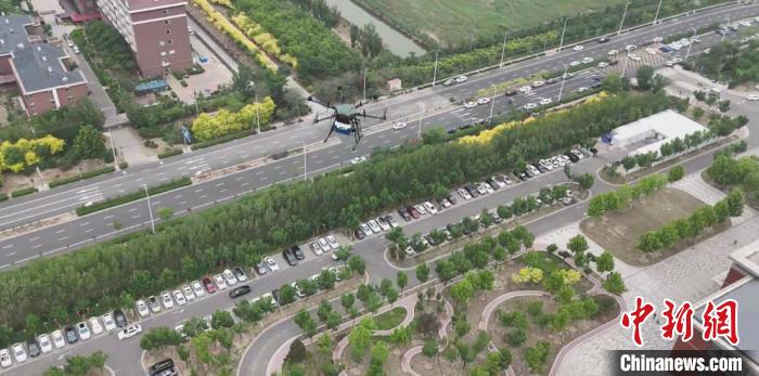 搭載模擬急救血液的無人機在飛行途中。(天津醫(yī)科大學(xué)腫瘤醫(yī)院 供圖)