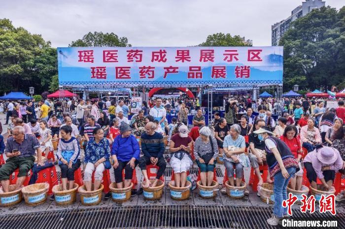 在瑤醫(yī)藥健康服務(wù)區(qū),來自湖南中醫(yī)藥大學(xué)中醫(yī)學(xué)院、湖南中醫(yī)藥大學(xué)第二附屬醫(yī)院、湖南省中西醫(yī)結(jié)合醫(yī)院、湖南永州市中醫(yī)醫(yī)院、湖南江華人民醫(yī)院、江華民族中醫(yī)醫(yī)院、江華瑤醫(yī)藥研究所等單位的專家集體“出攤”,為群眾望聞問切,定制健康方案。