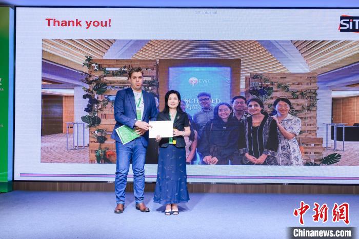 圖為福州大學(xué)生物科學(xué)與工程學(xué)院院長汪少蕓教授為參會外籍學(xué)者頒發(fā)演講證書。福州大學(xué)供圖