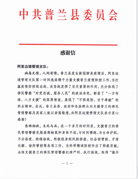 中國西藏網訊 “普蘭縣發(fā)生新冠肺炎疫情后,阿里邊境管理支隊第一時間選派精干力量支援普蘭疫情防控工作,為打贏疫情防控阻擊戰(zhàn)、攻堅戰(zhàn)發(fā)揮了至關重要的作用?!?0月2日,西藏自治區(qū)阿里邊境管理支隊收到一封來自阿里地區(qū)普蘭縣委的感謝信。信中對阿里邊境管理支隊戰(zhàn)“疫”一線民警在一個多月的疫情防控工作中,克服困難、勇于擔當、不分晝夜、持續(xù)奮戰(zhàn)的抗疫工作表達了感謝,給予了肯定。