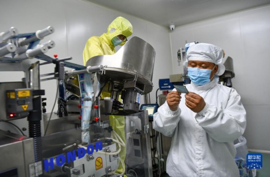 普窮次仁在檢查藏藥內(nèi)包生產(chǎn)工序(4月20日攝)。新華社記者 晉美多吉 攝