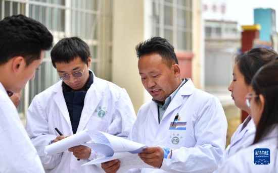 普窮次仁和學(xué)生們一起學(xué)習(xí)中醫(yī)藥相關(guān)政策(4月20日攝)。新華社記者 晉美多吉 攝