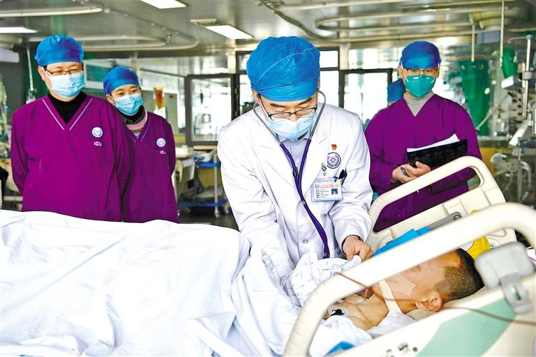 圖為北京大學(xué)人民醫(yī)院援助自治區(qū)人民醫(yī)院重癥醫(yī)學(xué)科副主任醫(yī)師王斌(中)在和本地醫(yī)生一起查房。 記者 王敏 攝