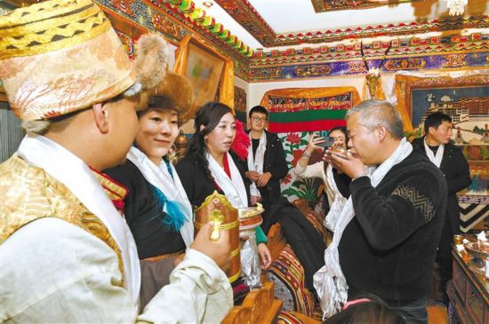 游客們在拉薩市城關(guān)區(qū)奪底街道維巴村體驗(yàn)藏歷新年的別樣風(fēng)俗。記者 格桑倫珠 唐斌 攝