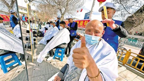 在拉薩市開展的“ 民族團(tuán)結(jié)一家 巧手剪出民族情”愛心義剪志愿服務(wù)活動(dòng)中,理發(fā)師們?yōu)楦髯迦罕娎戆l(fā)。記者 格桑倫珠 唐斌 攝