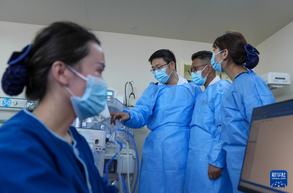 ?7月18日,來自大連醫(yī)科大學(xué)附屬第一醫(yī)院的援藏醫(yī)生田聰亮(左二)和同事在那曲市人民醫(yī)院新生兒重癥監(jiān)護(hù)室討論早產(chǎn)兒救治情況。新華社記者 晉美多吉 攝?