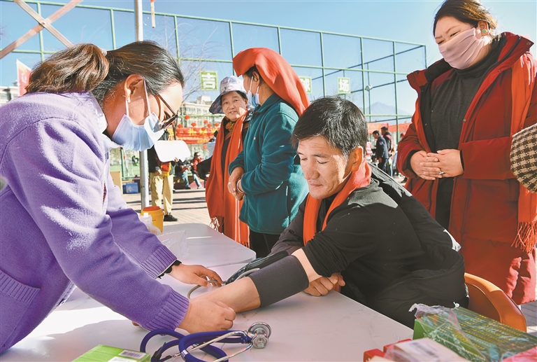 圖為在健康安全宣傳服務(wù)區(qū),工作人員為群眾免費(fèi)量血壓。記者 王敏 攝