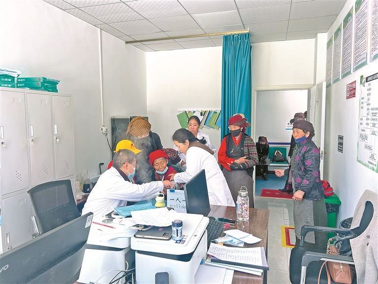 圖為瓊結縣拉玉鄉(xiāng)衛(wèi)生院醫(yī)護人員在為群眾看病。