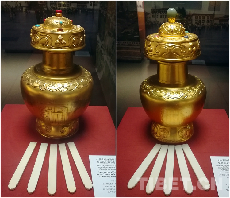 圖左為大昭寺進行金瓶掣簽的金瓶和象牙簽(復制品),圖右為雍和宮進行金瓶掣簽的金瓶和象牙簽(復制品)。攝影:李元梅