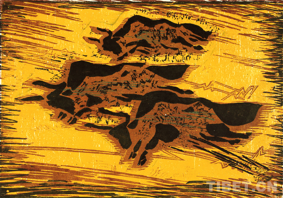 如果非要說我在版畫技法上有什么創(chuàng)新,參照西藏匠人刻經(jīng)文,在石頭上刻出來然后印出來也許就算。這不是一般石版畫概念,那叫石印,平版印刷;我這是凹版印刷。刻起來很費勁,我也不管費不費勁。我有一批這樣的石刻作品。綜合版作品手法較多,我通常分別在石板和木板上刻,然后套起來印。如果搞學(xué)術(shù)交流,也許值得一談。至于說到創(chuàng)新,第一我不認(rèn)為我有什么創(chuàng)新,第二我不認(rèn)為在藝術(shù)上、在美術(shù)上能夠輕易談創(chuàng)新這個詞。還有第三個觀點:不需要創(chuàng)新。很簡單,你先把傳統(tǒng)學(xué)到手再說。既是傳統(tǒng),就有它的存在理由,否則早就夭折了,還傳什么統(tǒng)呢?傳,而且統(tǒng)?。〗y(tǒng)是什么意思?基調(diào)是它統(tǒng)一起來的。先把傳統(tǒng)學(xué)到手,爐火純青了,神來之筆出現(xiàn)了,才有可能有所創(chuàng)造。基礎(chǔ)是重要的。
