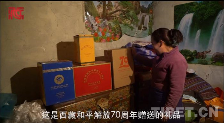 “新春走基層”采訪組一行在藏族群眾查斯家入戶采訪時,驚喜地發(fā)現(xiàn)家中完好整齊地陳列著中央代表團贈送的西藏自治區(qū)成立50周年、西藏和平解放60周年、70周年紀(jì)念品禮盒
