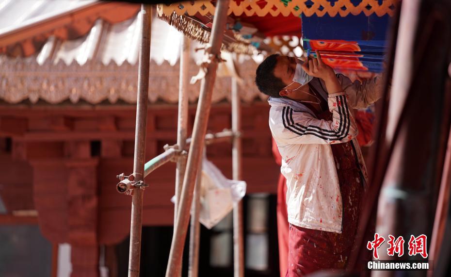 圖為強巴寺的僧人在刷新房屋。中新社記者 蘇丹 攝