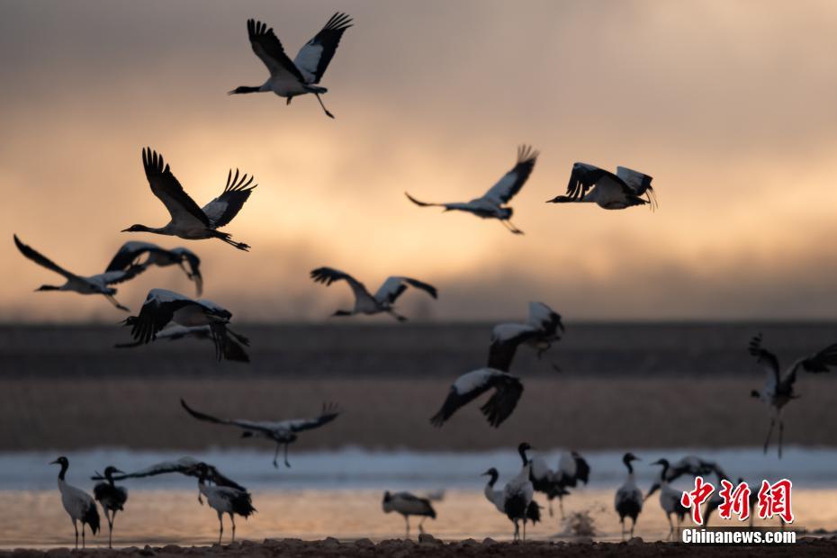 2月17日,西藏拉薩市林周縣黑頸鶴保護(hù)區(qū)內(nèi),黑頸鶴翩躚起舞、分外美麗。中新社記者 何蓬磊 攝