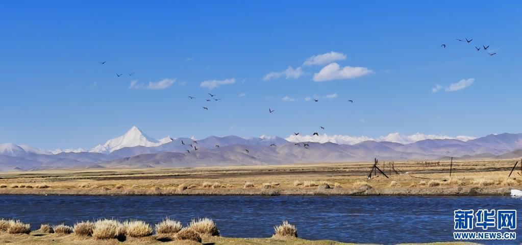 5月16日,在西藏仲巴縣里孜口岸附近,一群斑頭雁飛翔在湖泊和雪山之間(手機照片)。新華社記者 沈虹冰 攝