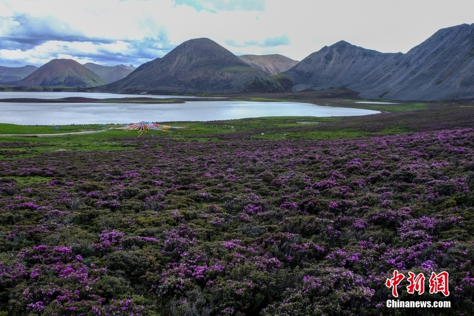 6月23日,思金拉措湖畔紫色鮮花盛開,景色秀麗。思金拉措位于西藏墨竹工卡縣日多鄉(xiāng),海拔4500多米,周邊群峰簇?fù)恚匦为q如聚寶盤,不少民眾將其稱為西藏的“財(cái)神湖”。 中新社記者 江飛波 攝