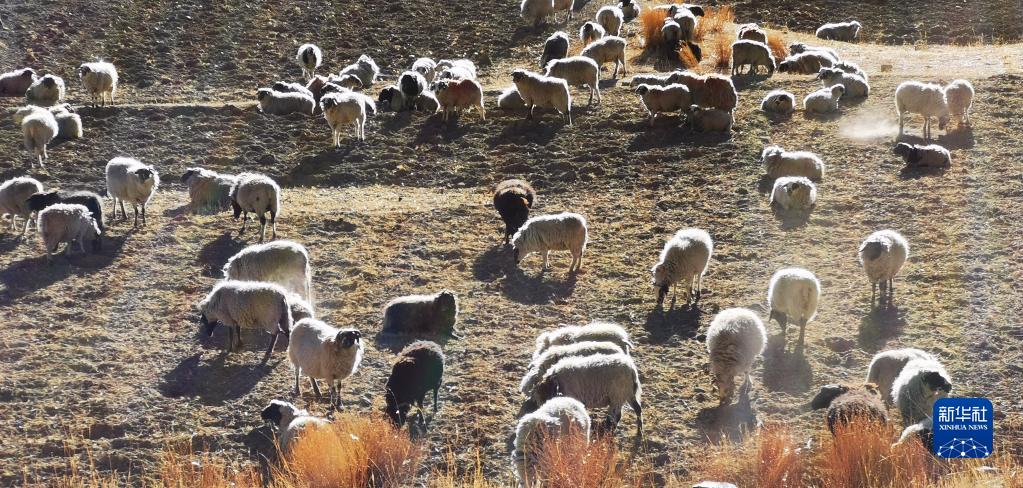 夕照下的羊卓雍措附近的羊群(11月7日,手機拍攝)。新華社記者 沈虹冰 攝