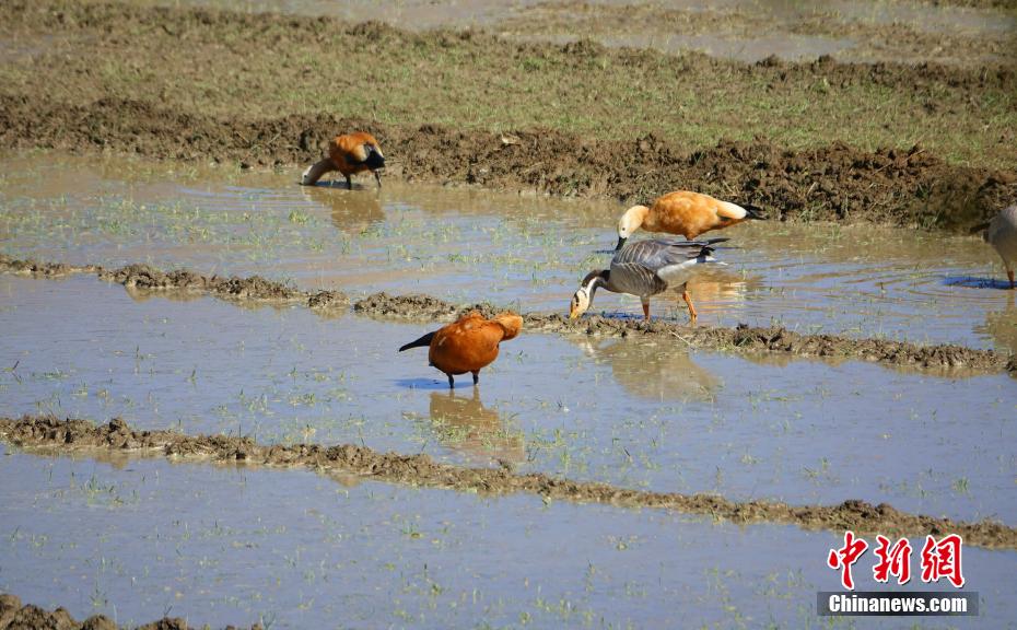圖為11月12日,斑頭雁、赤麻鴨等鳥類在西藏山南市扎囊縣境內(nèi)的農(nóng)田內(nèi)。冉文娟 攝