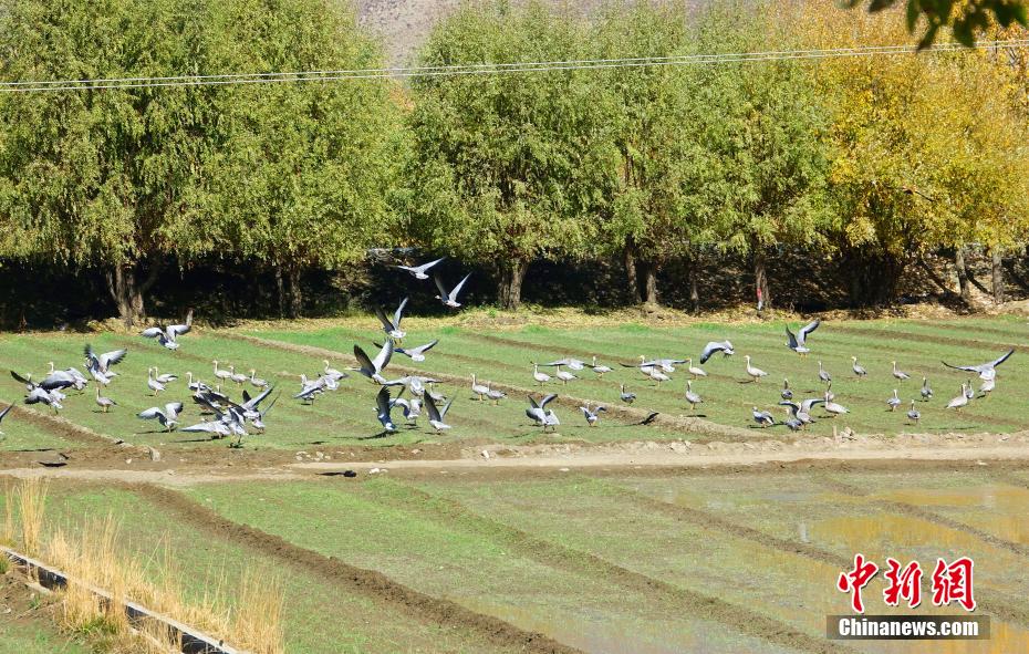 圖為11月12日,斑頭雁等鳥類在西藏山南市扎囊縣境內(nèi)的農(nóng)田覓食。冉文娟 攝