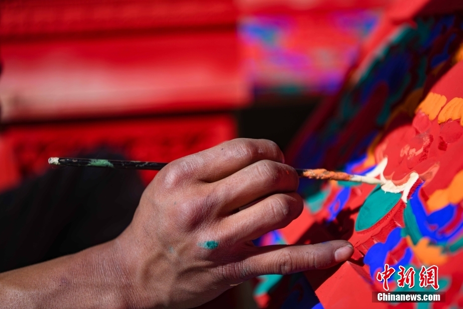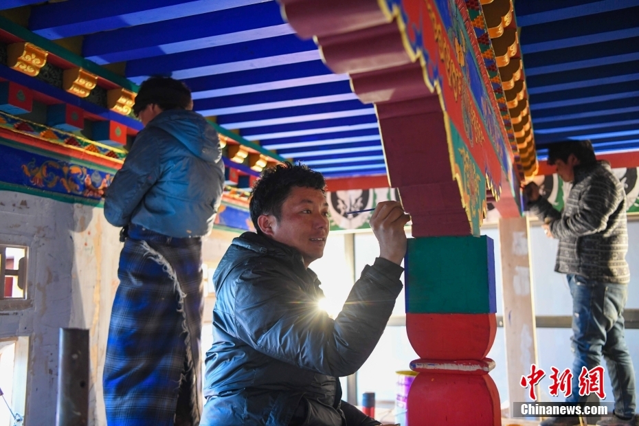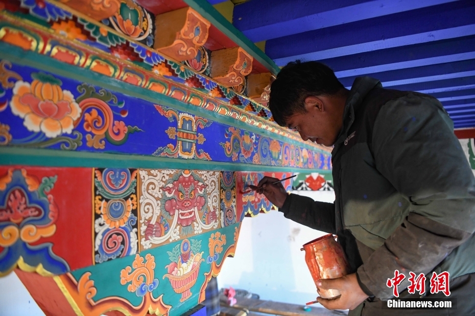 12月28日,西藏拉薩堆龍德慶區(qū),古俗民族傳統(tǒng)手工藝發(fā)展專業(yè)合作社員工在房屋上繪制藏式裝飾。據悉,該合作社以繪畫、木工、縫紉為主,承接傳統(tǒng)手工藝方式制作家具、房子裝修、唐卡繪畫、旅游產品、文物建筑維修等工作。自2018年合作社成立至今,帶動就業(yè)共60余人。 中新社記者 貢嘎來松 攝
