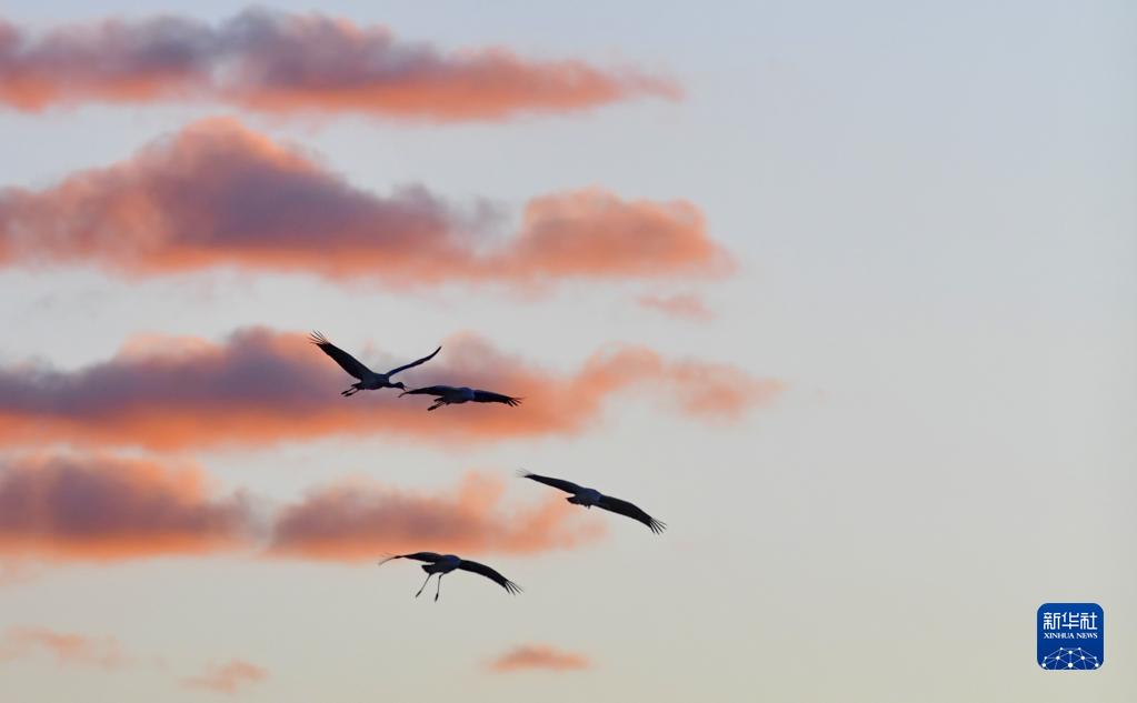 黑頸鶴在拉薩市林周縣黑頸鶴自然保護區(qū)飛翔(1月8日攝)。新華社記者 張汝鋒 攝