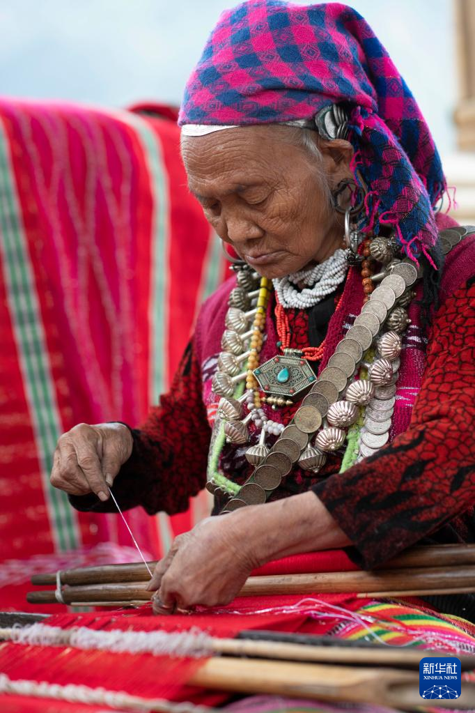 今年72歲的本央老人,是僜人服飾制作技藝西藏自治區(qū)級非遺傳承人。在西藏林芝市察隅縣沙瓊村,老人身著傳統(tǒng)的僜人服飾,在自家的涼亭里編織布料。