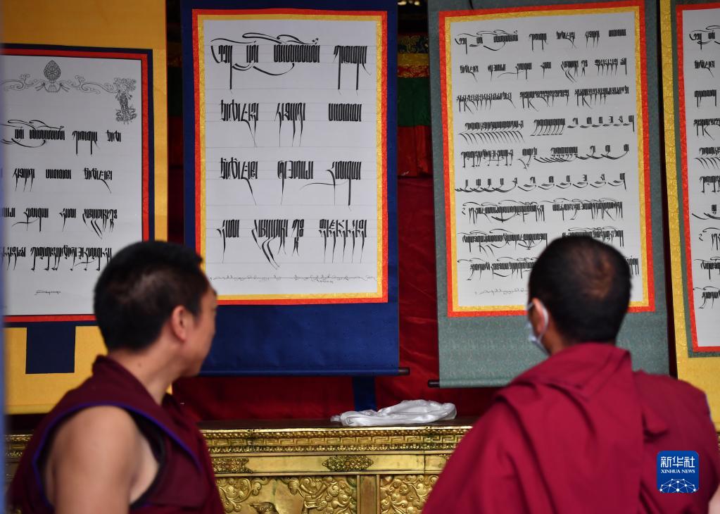 當(dāng)天,西藏拉薩大昭寺舉行第三屆藏文書法展。50多名僧人創(chuàng)作的120多幅藏文書法作品,展示了不同字體書寫的藏文之美。