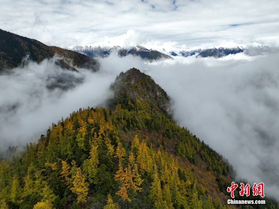 10月26日,航拍西藏多雄拉雪山,雪山與層林盡染的森林組成一幅壯美的秋日高原畫卷。西藏林芝多雄拉雪山位于喜馬拉雅山脈北段主脊,曾是徒步進(jìn)入墨脫縣最艱險的路段之一。(無人機照片) 中新社發(fā) 董志雄 攝