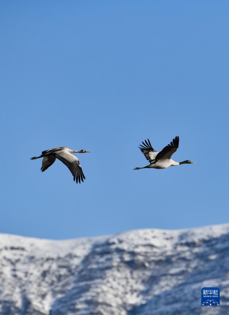 在拉薩市林周縣唐嘎鄉(xiāng),黑頸鶴在雪山前飛翔(3月1日攝)。新華社記者 晉美多吉 攝
