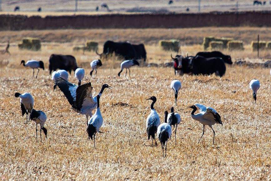 西藏日喀則:越冬黑頸鶴成冬日田間美景