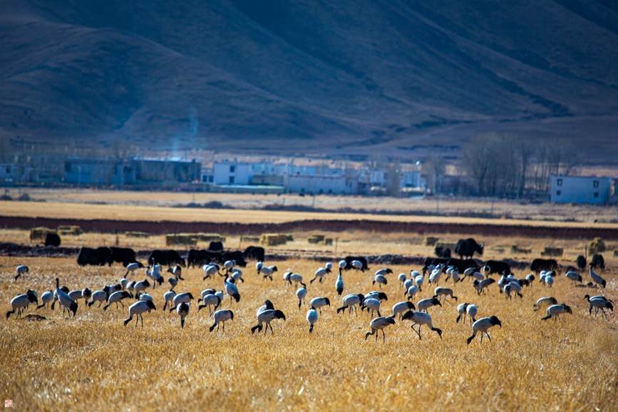 西藏拉薩市林周縣春堆村的黑頸鶴。南木加攝