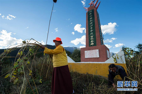 圖為頂果山寺第39世活佛丹貝降參(左),繼承前世活佛對紅軍的深情厚誼,堅(jiān)持尋找、精心收藏當(dāng)年紅軍的戰(zhàn)斗遺物和文物,維護(hù)著頂果山格勒得沙革命烈士紀(jì)念碑。