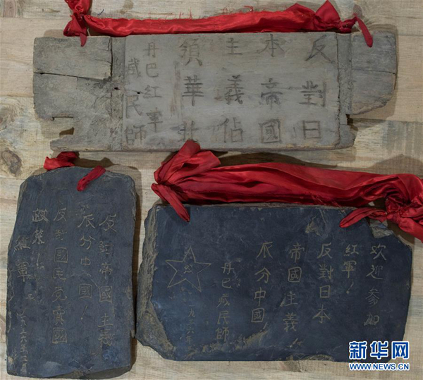 頂果山寺活佛丹貝降參收藏的當(dāng)年紅軍留下的寫有“歡迎參加紅軍!反對日本帝國主義瓜分中國!”字樣的木刻石刻宣傳標(biāo)語。