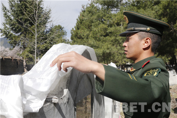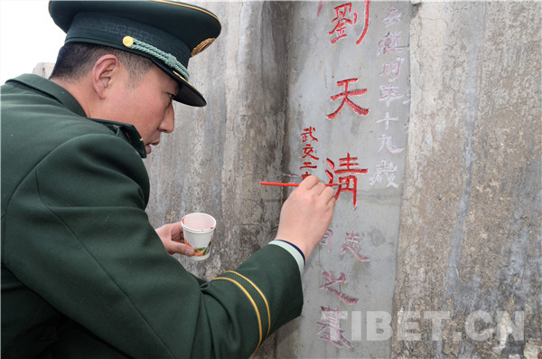 圖為駐拉薩武警戰(zhàn)士描寫墓碑上烈士的姓名。攝影:王闖