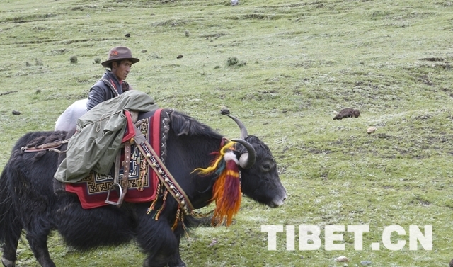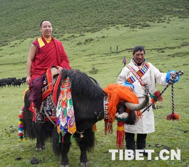 圖為十一世班禪騎著牦牛漫步牧場(chǎng)。攝影:王淑