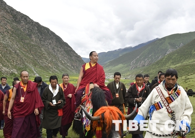 圖為在眾人簇?fù)硐买T著牦牛的十一世班禪。攝影:王淑