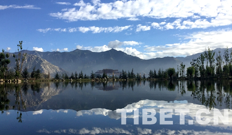 1)步入鵬矗生態(tài)園,沿著游步道緩緩前行,十一世班禪在布宮鏡湖景點稍作停留。此時,微波蕩漾的湖面雖未將神圣而莊嚴(yán)的布達(dá)拉宮映入畫卷,但從遠(yuǎn)處觀賞,也另有一番景致。十一世班禪拿出手機、俯下身子,將眼前的布達(dá)拉宮記錄下來。