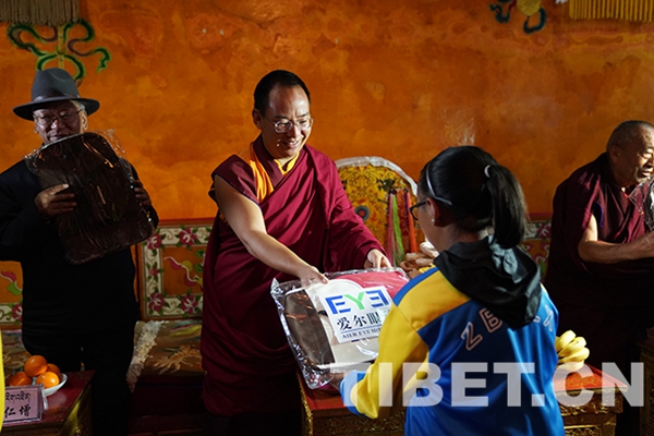 十一世班禪為學(xué)生代表捐贈愛心書包。攝影:王淑