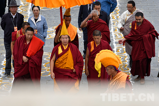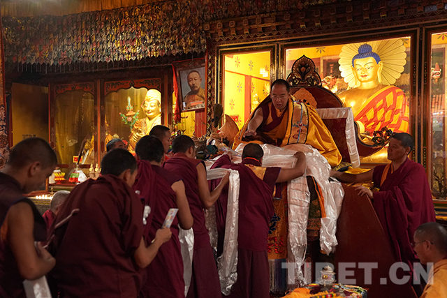 十一世班禪頭戴金色佛冠,由手持香炷的僧人引領,緩緩步入杜康大殿。在僧人們渾厚的誦經(jīng)聲中,十一世班禪登上法座,領誦經(jīng)文。寺廟僧人向十一世班禪敬獻曼扎等,十一世班禪微笑接過后,為僧人摸頂賜福,并發(fā)放布施、供齋茶齋飯。隨后,十一世班禪朝拜珍珠唐卡殿。