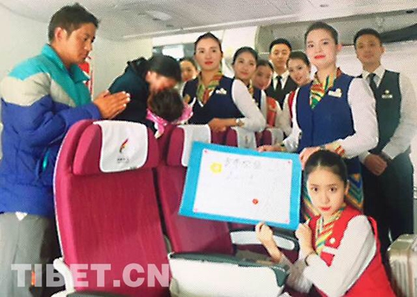 圖為2017年4月30日,TV9815從拉薩到北京執(zhí)飛途中,格?;ò嘟M護送因燒傷急需赴京救治的1歲零7個月的貢布次旦一家,并為其募款。藏航供圖