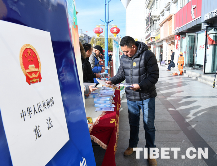 圖為12月5日,在拉薩市宇拓路,一位市民在西藏自治區(qū)氣象局憲法宣傳展臺(tái)前認(rèn)真翻看法治宣傳資料。