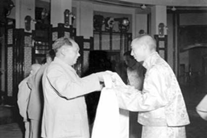 圖為十世班禪向毛澤東主席敬獻(xiàn)哈達(dá)。1954年,十世班禪受到毛主席等國(guó)家領(lǐng)導(dǎo)人的親切接見(jiàn)。他敬獻(xiàn)給毛主席的珍貴禮品表達(dá)了熱愛(ài)祖國(guó)大家庭、擁護(hù)黨的民族政策和人民領(lǐng)袖的心情。圖片來(lái)源:中國(guó)西藏之聲網(wǎng)