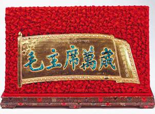 圖為金盾:毛主席萬(wàn)歲。1951年5月,十世班禪大師敬獻(xiàn)毛澤東主席的禮品。金盾主體部分的五星紅旗是銅質(zhì)鍍金,珍珠鑲嵌旗面周?chē)?,綠松石鑲嵌字體,右側(cè)藏文為“班禪額爾德尼敬獻(xiàn)”。圖片來(lái)源:民族文化宮 許娜攝