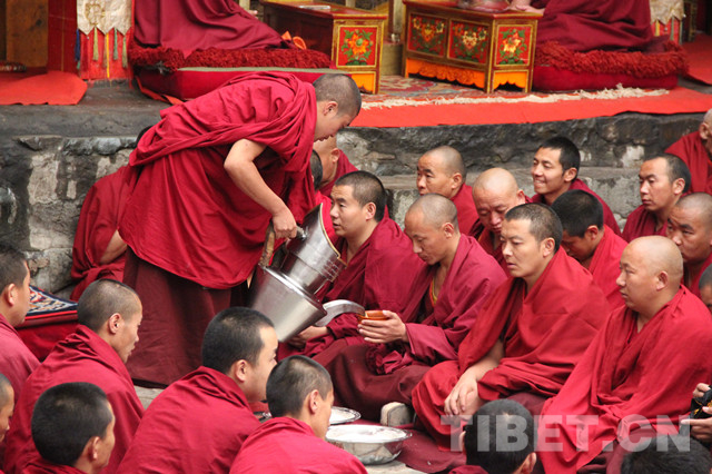 藏族社會的飲茶之風,從藏傳佛教寺院僧眾一天的生活中也能窺見一斑。通常僧人們每日集體飲三次茶,即在早、中、晚三個時間段的誦經(jīng)禮佛活動后,由寺院統(tǒng)一熬茶分給他們喝。特別是在舉行法事活動的時候,僧人飲茶就表現(xiàn)得更為明顯:每當舉行法事儀式時,莊重肅穆的經(jīng)堂內(nèi),僧人們誦讀經(jīng)文。待斟茶之際,眾僧從自己懷里取出隨身攜帶的茶碗放在跟前,就有專門負責司茶的年輕僧人提著茶壺給眾僧斟茶。