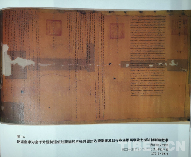 圖為《西藏自治區(qū)檔案館館藏蒙滿文檔案精選》中滿蒙藏文合璧的《乾隆皇帝為皇考升遐特遣使赴藏誦經(jīng)祈福并頒賞達賴喇嘛及各寺布施銀兩事致七世達賴喇嘛敕書》。攝影:李元梅