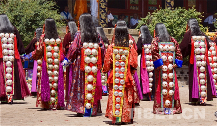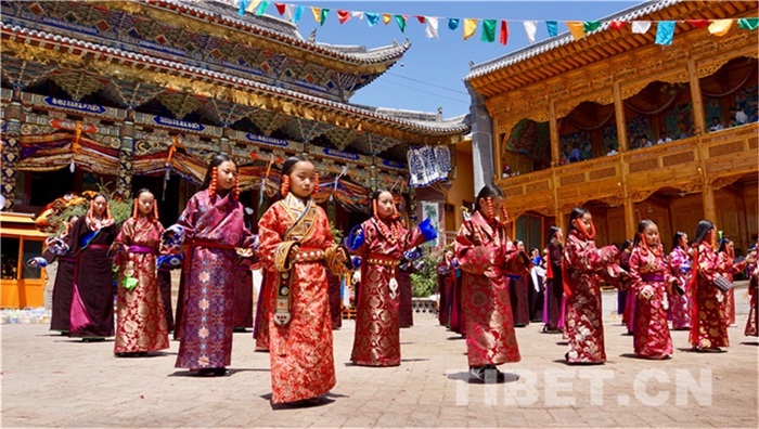 六月會期間有多場舞蹈表演,參與者是年輕的未婚女子,她們穿上最隆重的藏袍,綴上珊瑚蜜蠟松石銀飾,精施粉黛,莊重優(yōu)雅地舉手抬步緩行。舞蹈的動作簡單緩慢,但是女孩子們個個奪目。