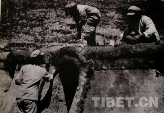 隨后,根據(jù)領(lǐng)導(dǎo)指示,各大隊(duì)沿山坡兩邊挖掘坑洞。4月的甘孜,有些凍土還沒(méi)化,必須先點(diǎn)燃草根將土層凍土融化,才比較好挖土地。接著是準(zhǔn)備修建窯洞所需的“建筑材料”,到離宿營(yíng)地?cái)?shù)十里外的山林里砍樹(shù)。用這些木材鋪?lái)敚厦驿伾蠋づ癫?,再堆上泥土。這樣建成的窯洞,倒也冬暖夏涼。修建窯洞群的戰(zhàn)士們頗為自豪地稱其為“康藏大廈”。